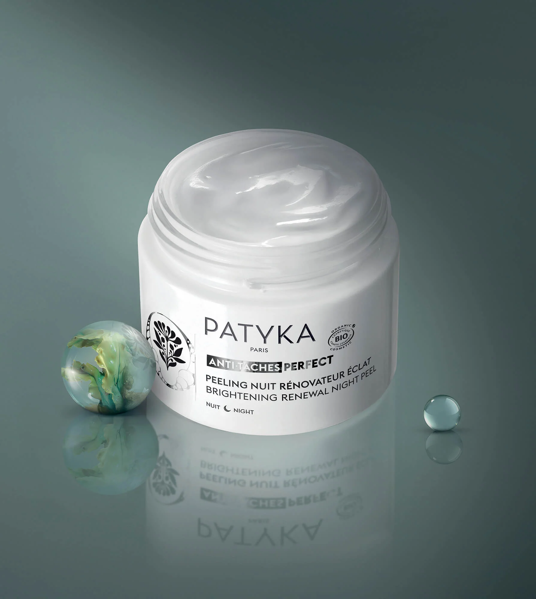 La Recherche Avancée PATYKA a mis au point un soin de nuit inspiré des peelings dermatologiques qui associe le pouvoir mélanoréducteur de la Fougère des Mers à une très haute concentration d’AHA (8%) pour accélérer l’élimination des taches, booster l’éclat de la peau et révéler un teint uniforme et lumineux nuit après nuit.